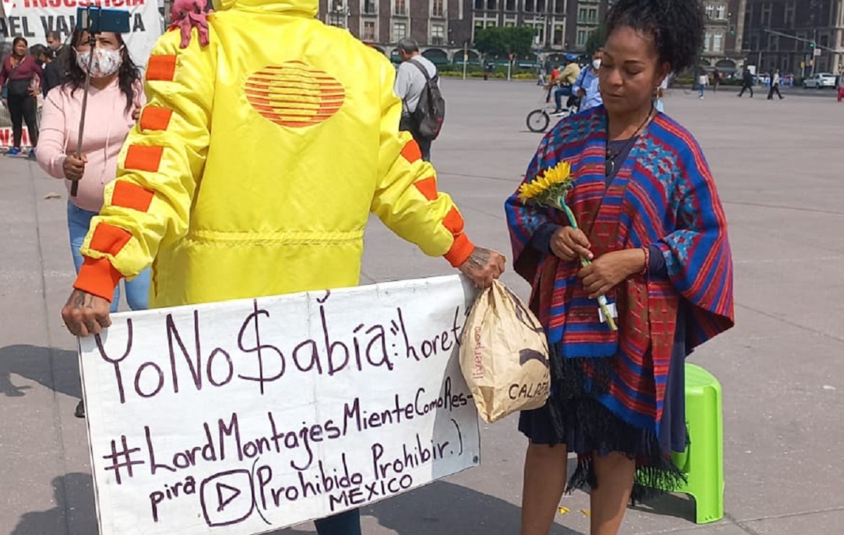 “#LordMontajes, mientes como respiras” afirmó la cónyuge de Vallarta, mientras sostenía una pancarta con el mismo mensaje en las inmediaciones del Zócalo capitalino.